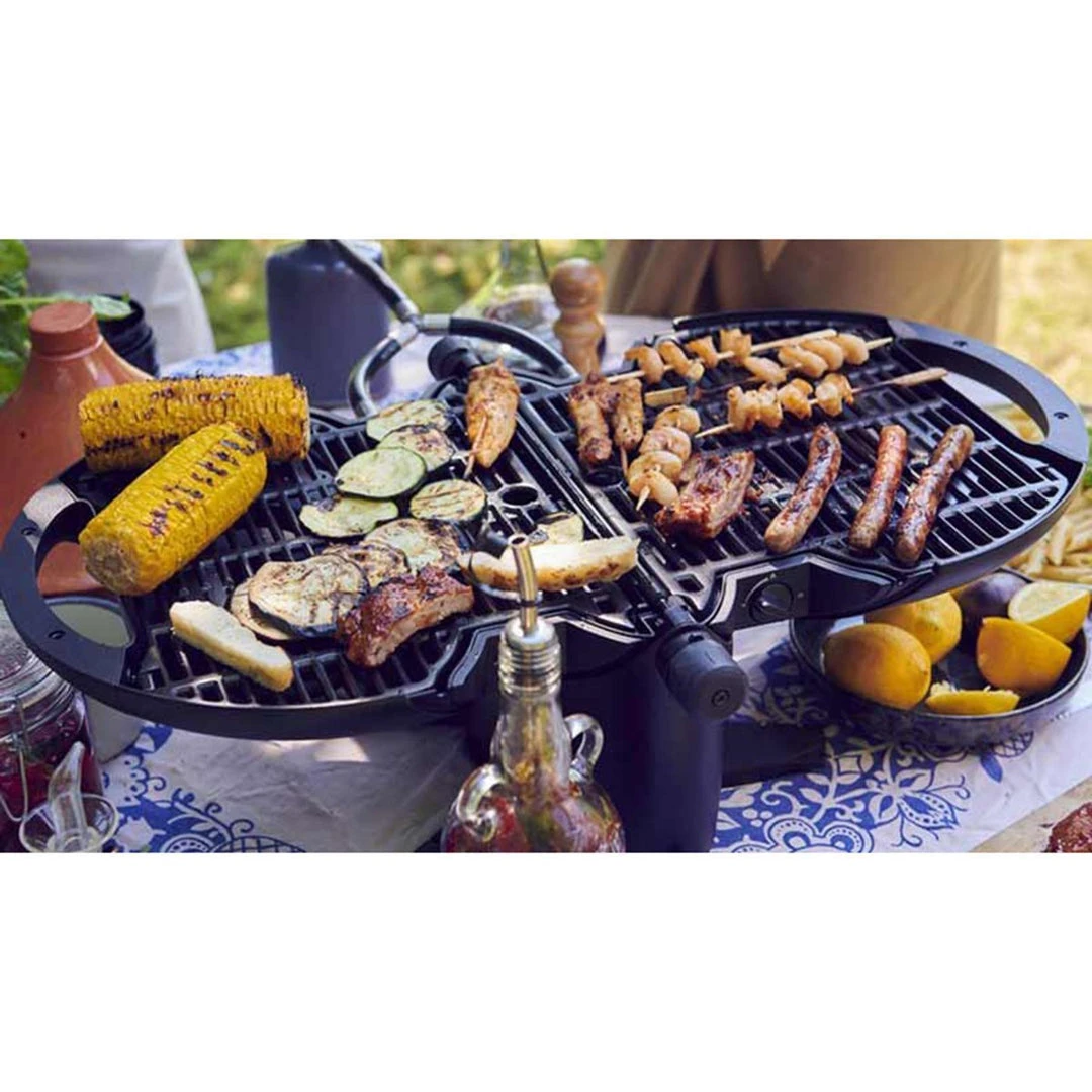 - Includes BBQ, gas hose with pressure distributor, 2 x grill racks and 2 x drip trays, carry strap and instruction manual