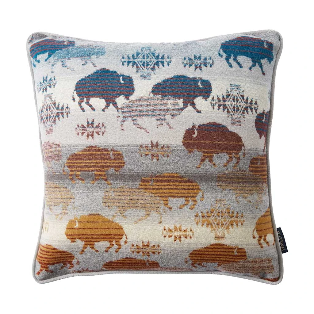 Add a rustic touch to your space with this Prairie Rush cushion from Pendleton. Woven in Pendleton’s traditional American mills, this cushion is made from a pure virgin wool blend and features the majestic buffalo that roam freely throughout Yellowstone National Park.