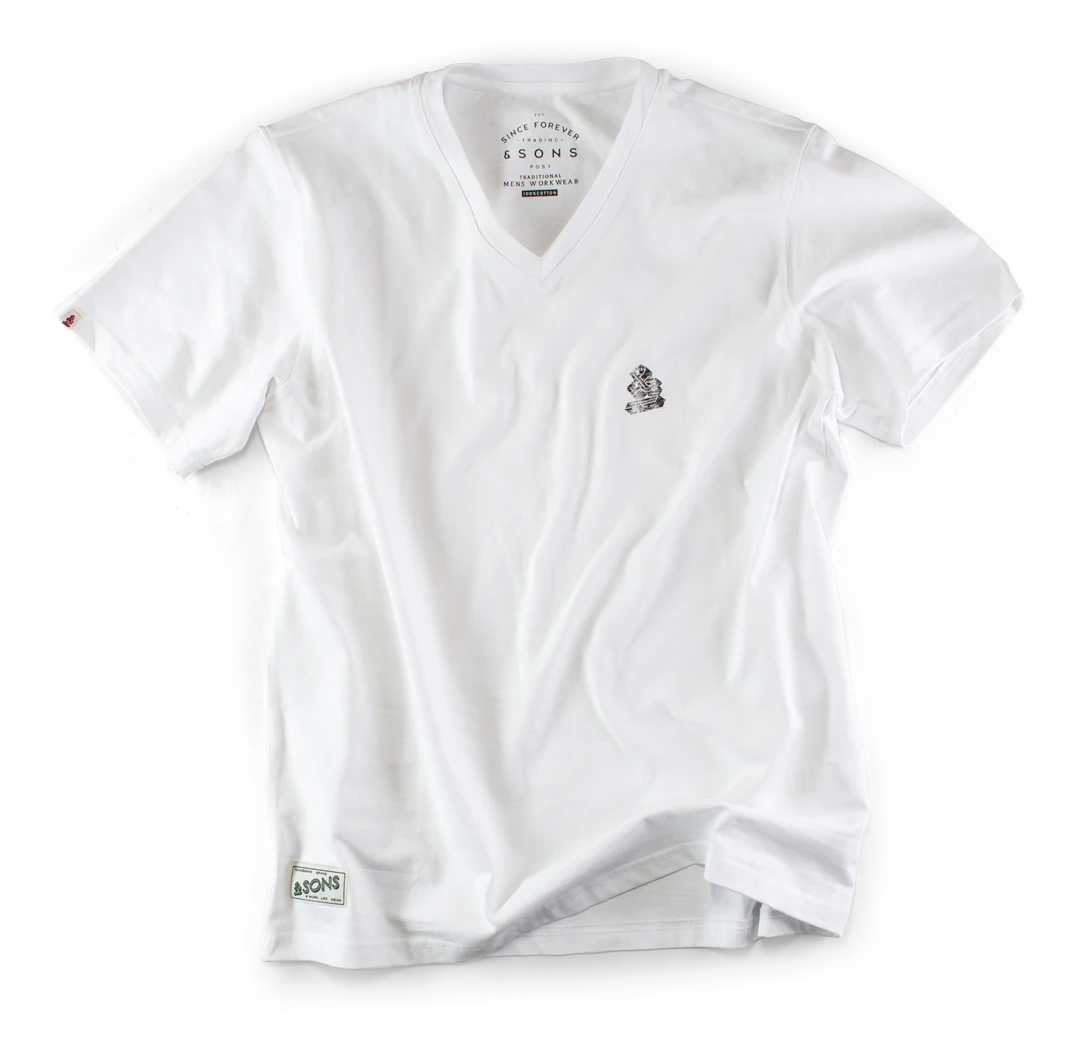 A classic v-neck 1960’s inspired T-shirt with a beautiful worn-in feel, thanks to the &SONS vintage wash process. Crisp white with faded and edges and Trading Post print inside the neck finished with our classic logo label on the sleeve.