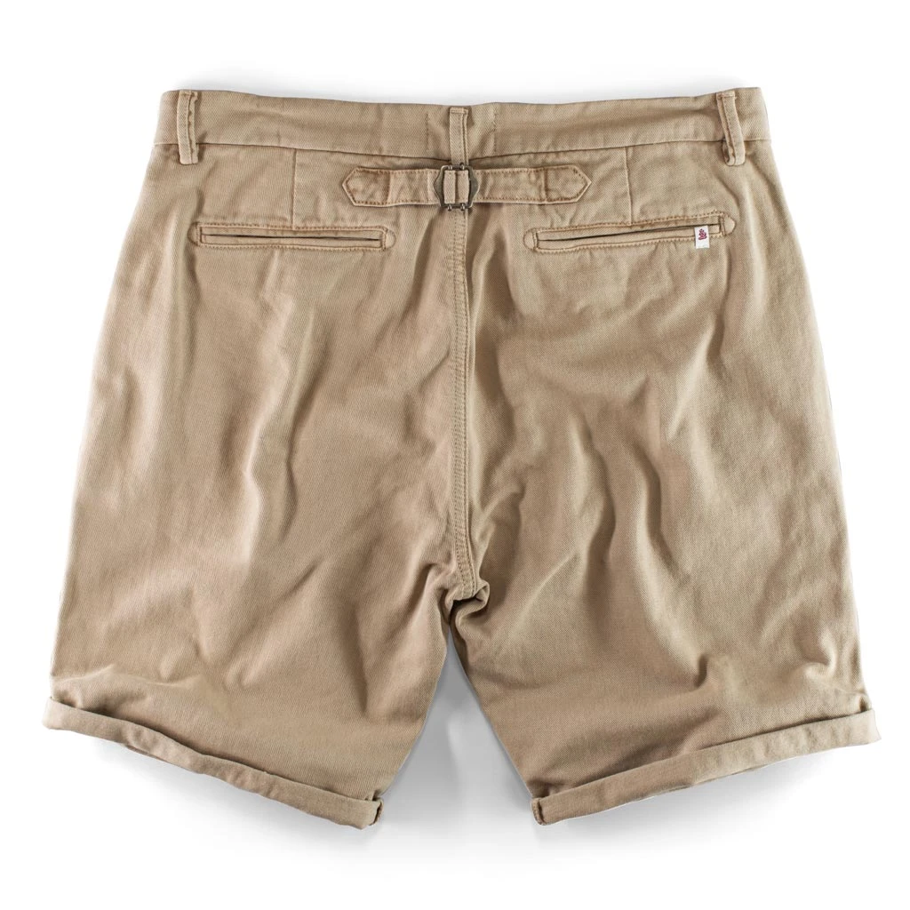 The cut and fit follow the same silhouette as the trousers and the inseam measures 22 cm with a slight turn up. Using a medium weight cotton twill and adding brass hardware, practical details, and a button tab turn up with angled pockets, pocket loop, and heavier cotton than traditional chino shorts. This gives them a tough, workwear finish but with the cut and style of the iconic design.